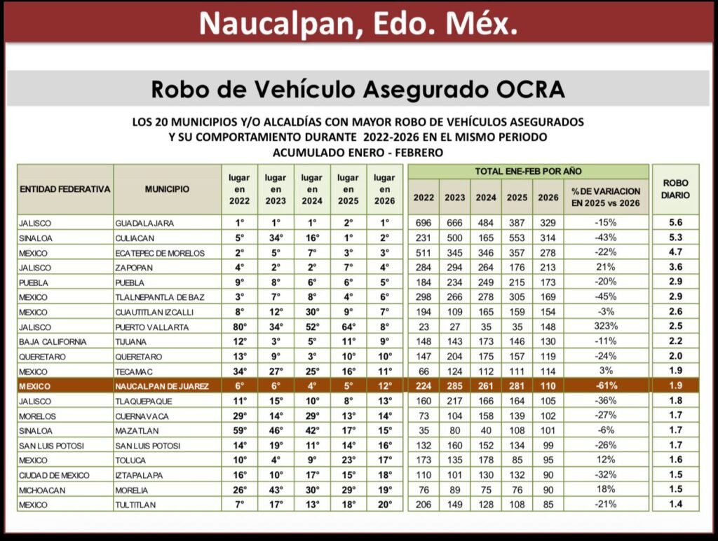 Según datos de OCRA —organismo que colabora con más de 23 aseguradoras, fiscalías y autoridades—, en 2026 Naucalpan se ubica en el lugar número 12 entre los 20 municipios con mayor incidencia, con un total de 110 vehículos robados y un promedio diario de 1.9 unidades, con y sin violencia.