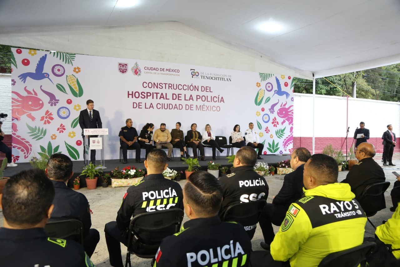 Durante la colocación de la primera piedra para la construcción del primero de tres hospitales generales de la policía, el también Comisario General sostuvo que “uno de los ejes fundamentales de la Estrategia de Seguridad y Construcción de Paz del Gobierno de la Ciudad de México, es el que se refiere a Más y mejor Policía: una corporación profesional, altamente capacitada, con sólidos e innovadores procesos de formación, y que cuenta con todas las herramientas para el óptimo desempeño de su labor”.