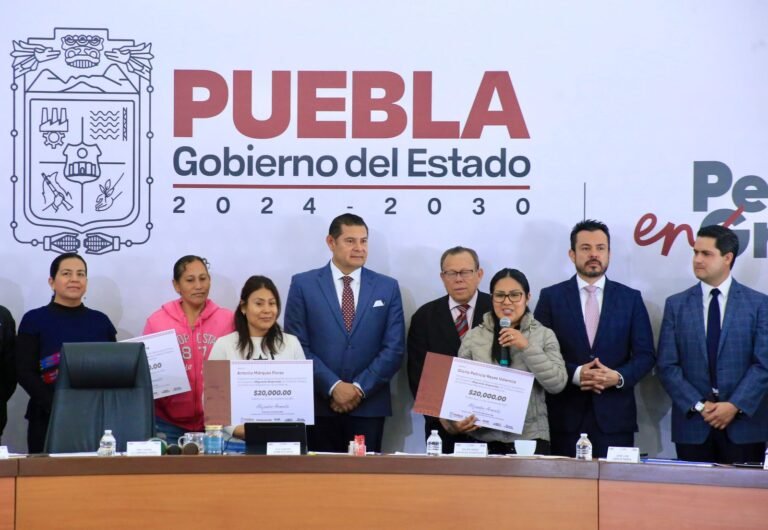 CIUDAD DE PUEBLA, Pue.- Con el compromiso de apoyar a las y los poblanos que regresan a la entidad, fomentar el desarrollo económico y el Amor a Puebla, el gobernador Alejandro Armenta durante la mañanera, encabezó la entrega de apoyos del Programa “Migrante Emprende”, a fin de generar autoempleo mediante un proyecto productivo o la instalación de un pequeño negocio que les permita tener un ingreso para el bienestar y desarrollo propio.