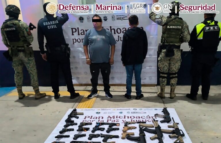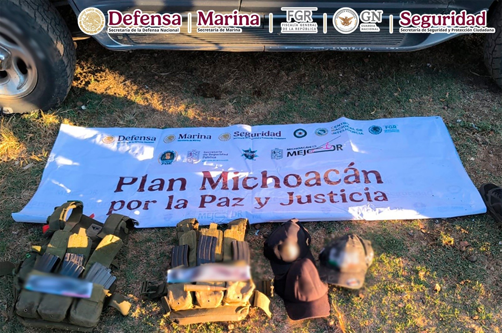 Michoacán.- Como parte de las acciones del Plan Michoacán por la Paz y la Justicia, elementos de la Secretaría de la Defensa Nacional (Defensa) y Guardia Nacional (GN), en coordinación con la Secretaría de Marina (Semar), Fiscalía General de la República (FGR) y Secretaría de Seguridad y Protección Ciudadana (SSPC), junto con autoridades locales, detuvieron a tres personas, aseguraron 36 armas de fuego, 1,086 cartuchos, 61 cargadores, un artefacto explosivo improvisado, nueve vehículos y equipo táctico.